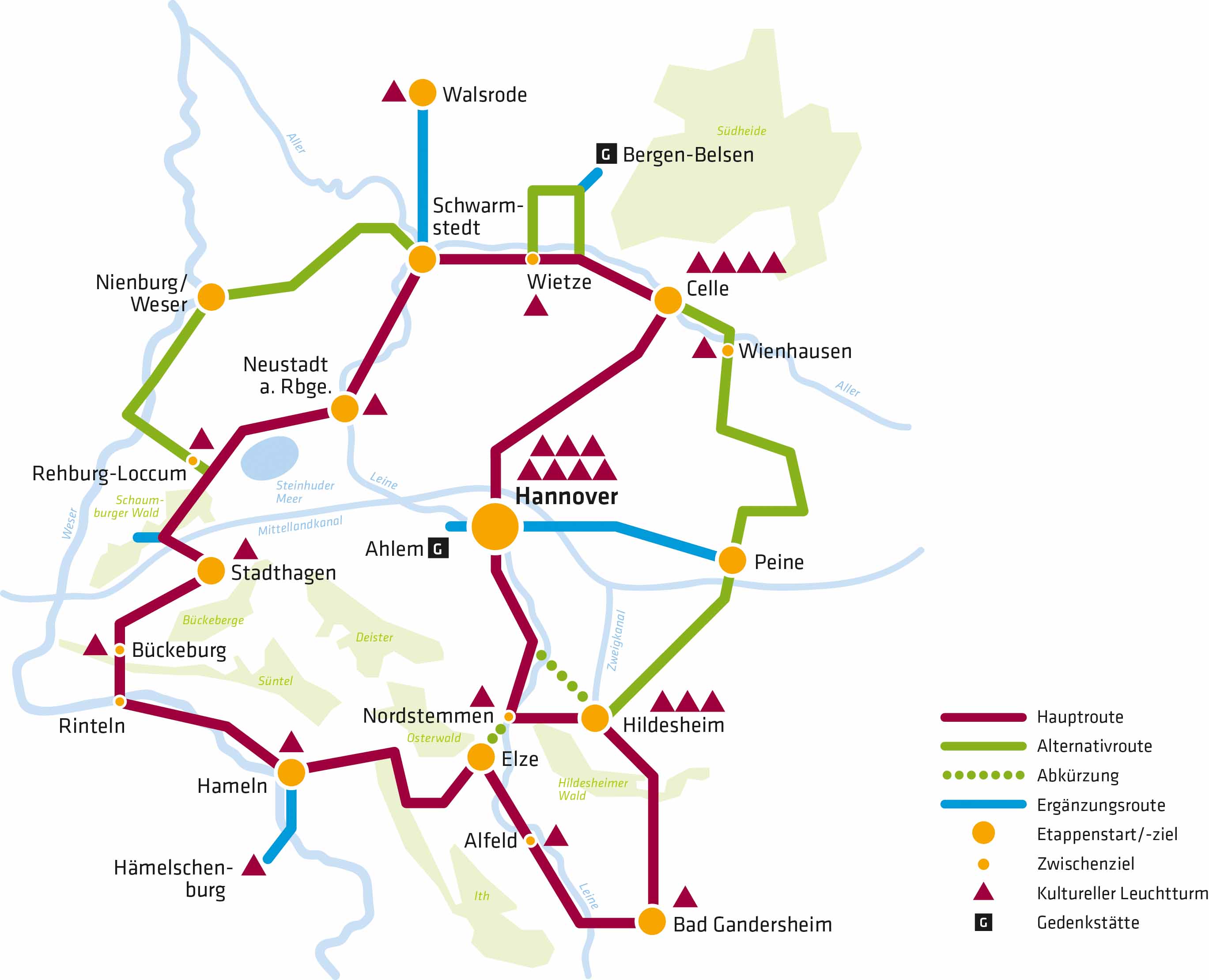 Zu den insgesamt 26 Leuchttürmen gehören natürlich bekannte Orte, wie das Celler Schloss in der historischen Fachwerkstadt, die Weltkulturerbestätten Dom und St. Michael in Hildesheim sowie der Rattenfänger in Hameln, das Sprengel-Museum für Moderne Kunst oder die weltberühmten Herrenhäuser Gärten in Hannover. Weitere, vielleicht noch nicht ganz so bekannte, Leuchttürme sind das im Bauhaus-Stil errichtetet Fagus-Werk in Alfeld (ebenfalls Weltkulturerbestätte), das aus der Epoche der Weserrenaissance stammende Mausoleum in Stadthagen, das Schloss Bückeburg mit Fürstlicher Hofreitschule sowie das mittelalterliche Kloster Loccum und das Erdölmuseum in Wietze. Darüber hinaus können auch Highlights wie der Weltvogelpark Walsrode, der Erlebnis-Zoo Hannover, der Dinopark Münchehagen oder JR Die Schokoladenfabrik in Peine erkundet werden.